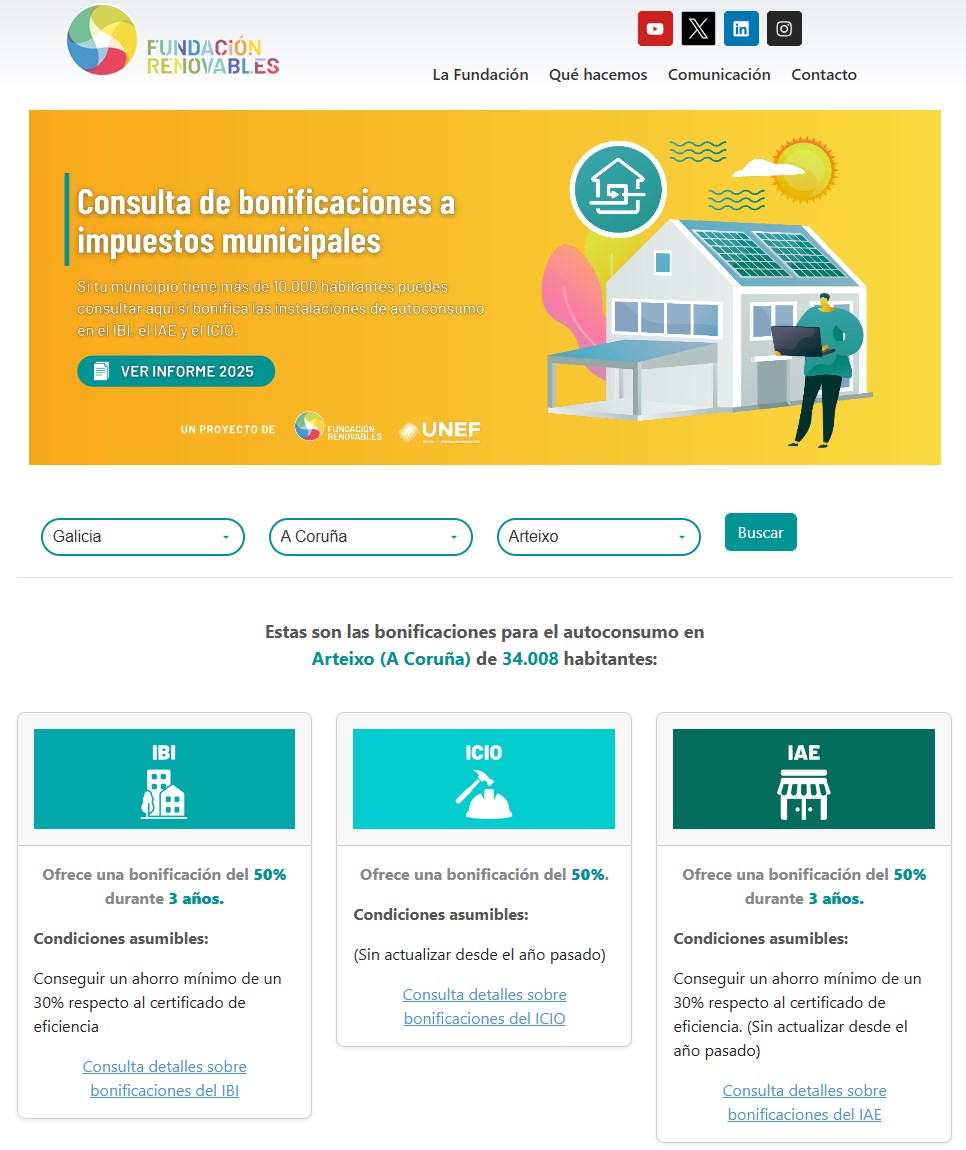 Enlace a la herramienta para instalaciones de autoconsumo: https://fundacionrenovables.org/autoconsumo/ibi-icio-iae/bonificaciones-ibi-icio-iae.html